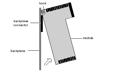 Swing the bottom of the module away and up from the backplane, pivoting it on the hooks holding the module at the top of the backplane, until the module detaches from backplane connector: