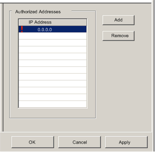 To remove a device from the Authorized Addresses list, select its IP address in the list, then click Remove. The selected IP address is removed.