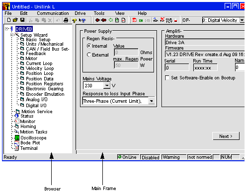 Click on the Motor, Resolver folders on the browser to declare the motor and the feedback parameters.