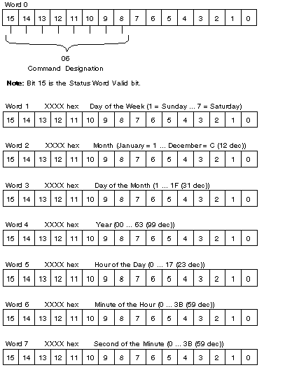 This command is executed only the first time it is received. To execute the command again, one of the Command Words, 0 to 7, needs to be changed. This is done so that the same time does not get continuously loaded until Command Word 0 changes to a command other than SET TOD.