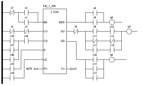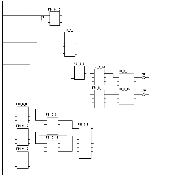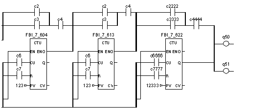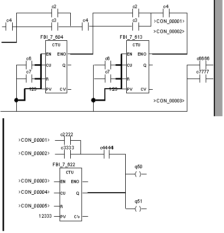 Example of an FFB connection between Boolean objects (coils, contacts, horizontal, and vertical connections) in Concept: