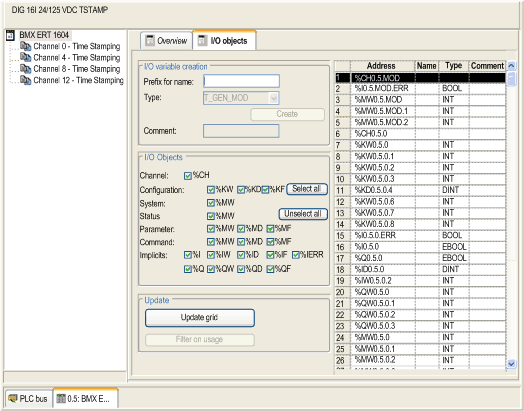 I/O objects tab displays objects, name, and an area for comment.