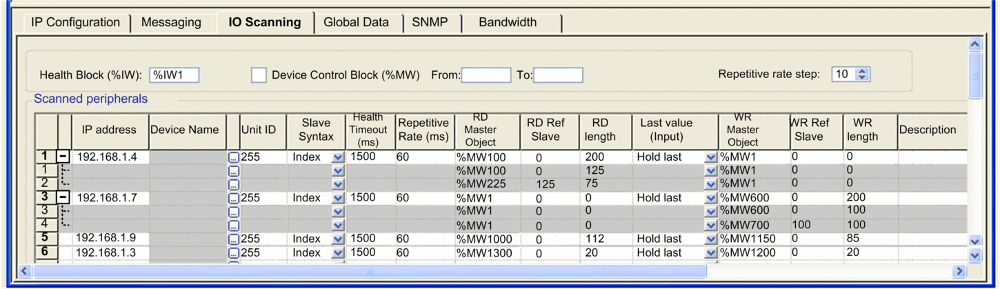 The 171 CBU 98090 and 171 CBU 98091 processors includes an I/O Scanning service that exchanges register data with remote devices on the network over Modbus TCP. The service is enabled using the I/O Scanning configuration tab in Control Expert.