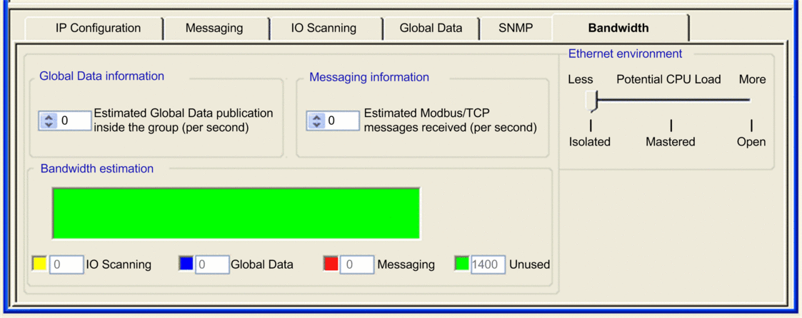 separately configure each component of Ethernet communications (Global Data, I/O Scanning, and Modbus Messaging) to control the bandwidth used by each service, and