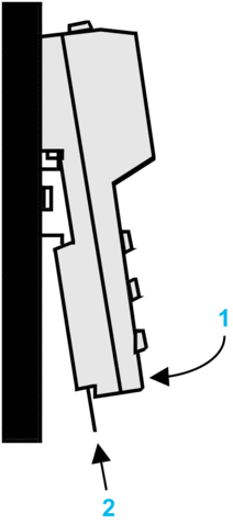 Hook the plastic tabs on the back of the device onto the DIN rail and swing the module down to rest against the rail. |