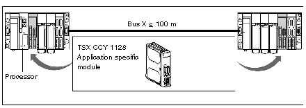 The diagram below represents the installation of the module onto a rack belonging to the main segment of bus X. The module can be installed onto the rack supporting the processor and onto all other racks present on bus X. The distance between the rack supporting the module and the rack supporting the processor must not exceed 100 meters.