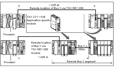 The diagram below represents the installation of the module onto a rack belonging to the remote segments of bus X. The distance between the rack supporting the module and the rack supporting the processor must, under no circumstances, exceed 225 meters.