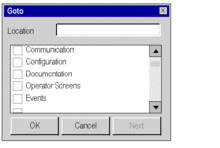 In the Location field type the first letter of the element you want to go to. Result: The element appears in reverse color in the Go to window. ![]() |