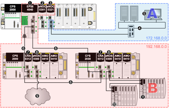 Pour faciliter les communications entre les hôtes A et B, connectez le réseau de contrôle et le réseau d'équipements, de manière physique et logique. Le service de transfert IP du module BMENOC0321 est l'interface de cette connexion réseau.