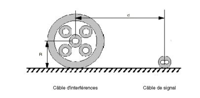 Pour conserver un effet protecteur correct, il est conseillé de respecter une distance entre les câbles supérieure à 5 fois le rayon "R" du plus gros d'entre eux :
