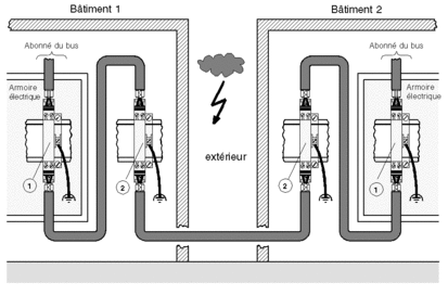 Pour protéger les équipements de transmission contre les surtensions induites par couplage sur les lignes (foudre), il convient d'intégrer des dispositifs de protection contre les surtensions dans les câbles de bus distants dès lors qu'ils sont posés à l'extérieur de bâtiments.