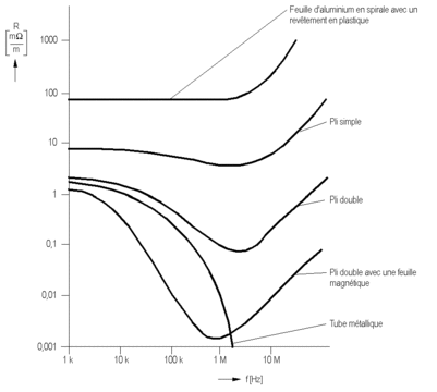Le schéma suivant représente l'impédance de couplage de différents blindages par câble en fonction de la fréquence :