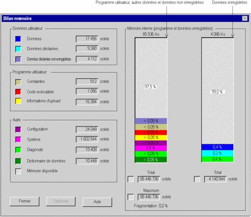 Cette zone montre l'organisation de la mémoire interne du contrôleur. Elle indique également l'espace mémoire disponible (), l'espace mémoire contigu maximal () et le niveau de fragmentation. |
