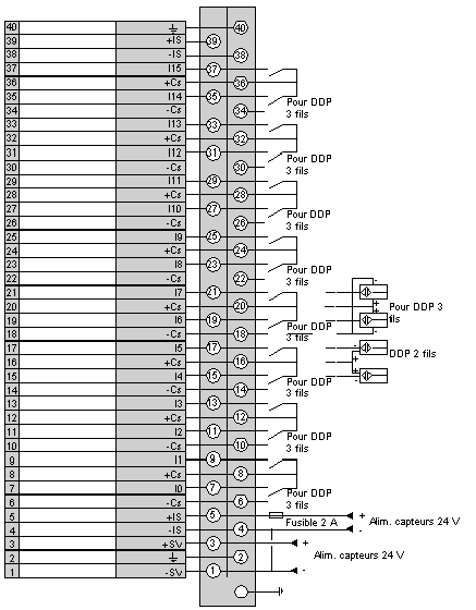 Il n'est pas nécessaire de relier entre elles les deux bornes +IS ainsi que les deux bornes -IS. Par contre, il est obligatoire de relier la borne -SV et une borne -IS (0 V).