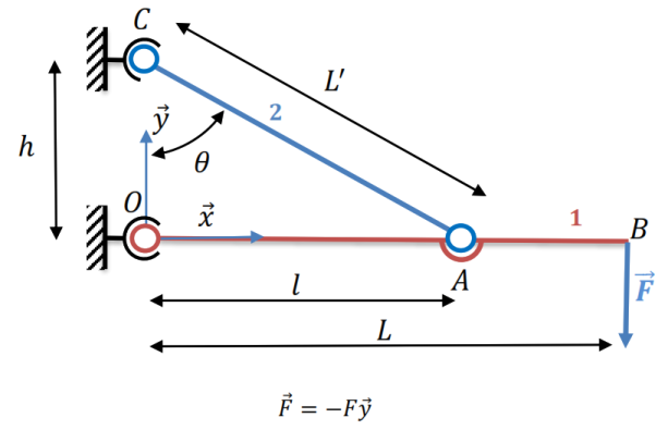 On néglige le poids propre de la poutrelle et du câble. Toutes les liaisons sont parfaites. On considère que les déformations de la pièce 1 sont négligeables par rapport à celles du câble.