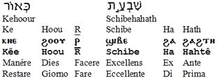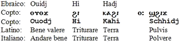 Segretario : Mi permetto di interrompere solo per ricordare brevemente ai ‘nuovi’ congressisti di oggi che è stata già ampiamente illustrata ieri2 la tecnica di Crombette sulla decifrazione dei monosillabi copti di cui erano composte le radici delle parole dell’antico ebraico, come pure la loro interpretazione e concatenazione logica alla maniera dei rebus, che era il modo di intendere l’egizio antico. Qui le antiche parole ebraiche sono scomposte nelle loro radici monosillabiche copte e quindi in latino e in italiano.
