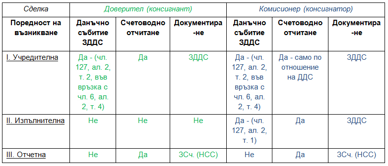 По силата на чл. 127 от ЗДДС (Изм. - ДВ, бр. 97 от 2016 г., в сила от 01.01.2017 г.), независимо от факта, че от търговско-правна гледна точка имаме три сделки, за целите на ЗДДС са налице единствено две доставки, поради което е налице съществено разминаване между отделните етапи на комисионните сделки и тяхното облагане с ДДС. Съгласно чл. 127, ал. 2 от ЗДДС, тези две доставки са: