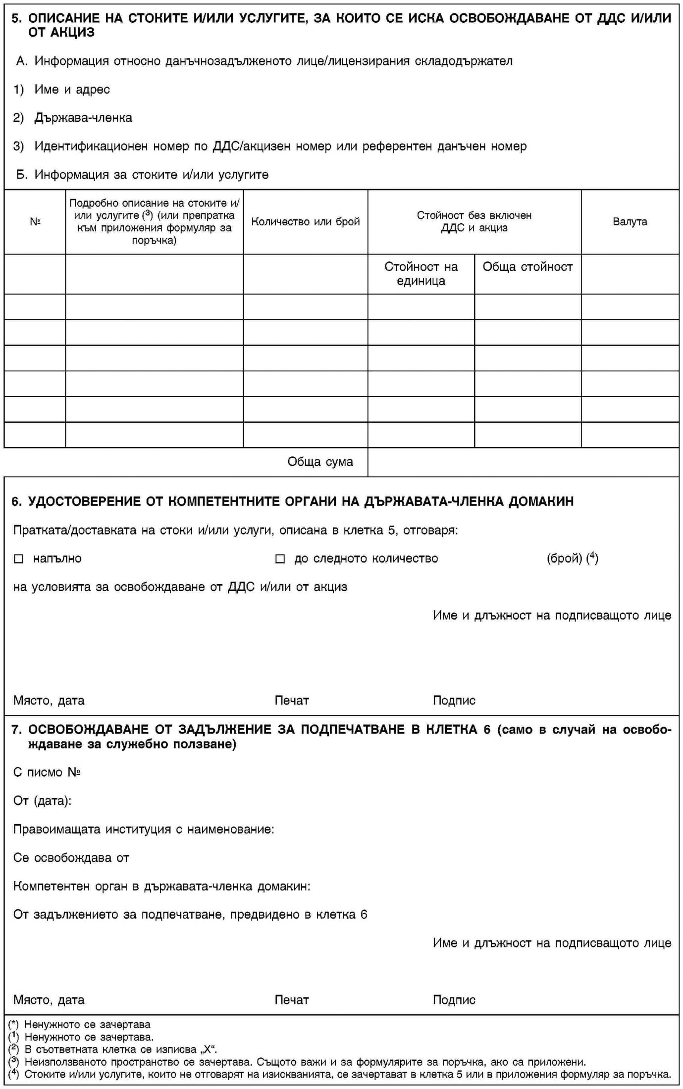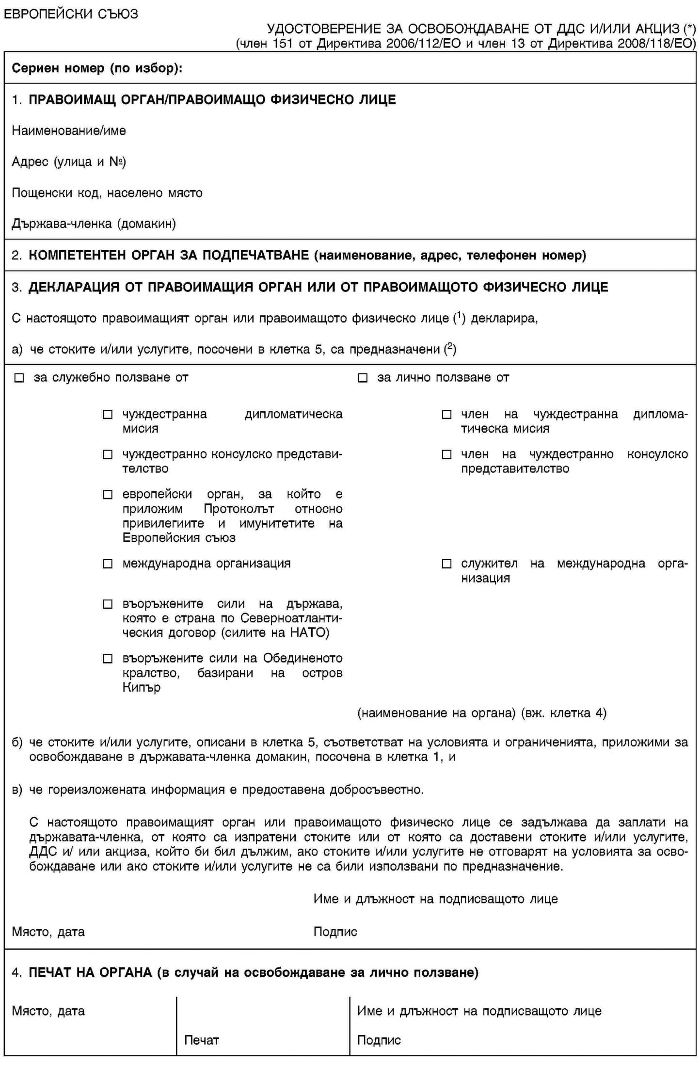 1. За доставчика и/или лицензирания складодържател настоящото удосто верение служи като документ, удостоверяващ правото на освобож даване от облагане на доставките на стоки и услуги или на пратките със стоки за правоимащите органи/физически лица, посочени в член 151 от Директива 2006/112/ЕО и член 13 от Директива 2008/118/ЕО. Съответно за всеки доставчик/складодържател се попълва по едно удос товерение. Освен това доставчикът/складодържателят е задължен да съхранява настоящото удостоверение в документацията си в съот ветствие с правните разпоредби, приложими в неговата държава-членка.