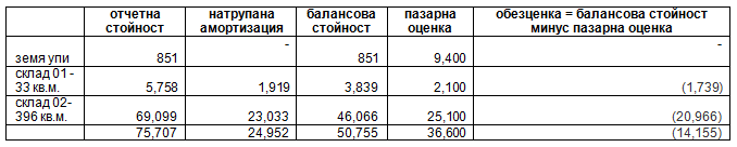 Фирма притежава ДМА: земя УПИ с отчетна стойност 851.10 лева; склад 01 - 33 кв.м. с отчетна стойност 5757.71 лева и балансова стойност към 31.12.2021 г. 3838.59 лева; склад 02 - 396 кв.м. с отчетна стойност 69 098.53 лева и балансова стойност към 31.12. 2021 г. 46065.61 лева. Фирмата представя в счетоводството пазарна оценка на посочените по-горе имоти от лицензиран оценител към 09.02. 2022 година както следва: земя УПИ - пазарна оценка - 9400 лева; склад 01 - 33 кв.м. - 2100 лева; склад 02 - 396 кв.м. - 25100 лева. Желанието е да се намали отчетната стойност до пазарна оценка и съответно да се намалят местните данъци и такси. Какви счетоводни записвания трябва да направим? Как ще се променят САП и ДАП. Фирмата прилага НСС?