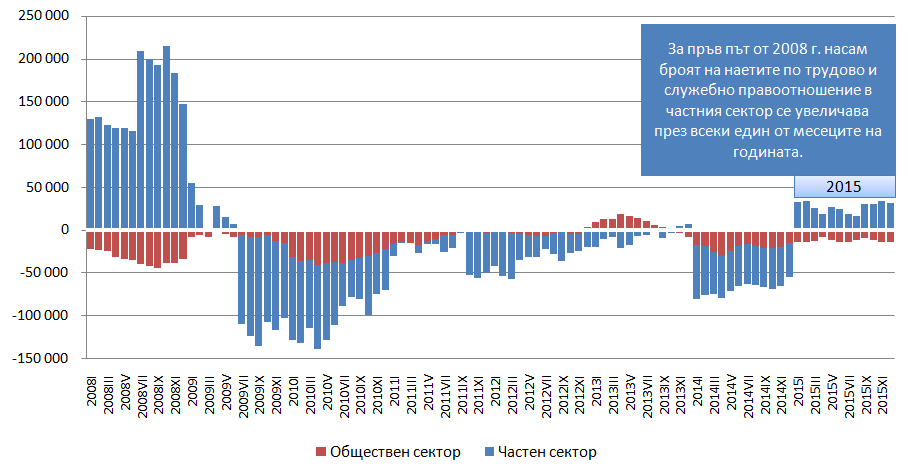 ➥ 2015 г. е първата година от 2008-ма насам, в която е налице стабилен ръст на броя на наетите по трудово и служебно правоотношение в частния сектор, а и в икономиката като цяло (Графика 1).