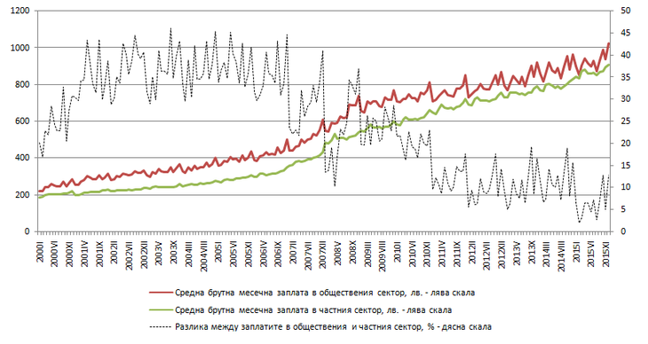 ➥ През месец декември 2015 г. средната месечна заплата на наетите в обществения сектор за пръв път надхвърля 1 000 лв.