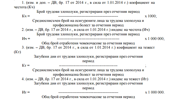 (2) При определянето на коефициентите по ал. 1 загубените дни от трудови злополуки са в календарни дни.