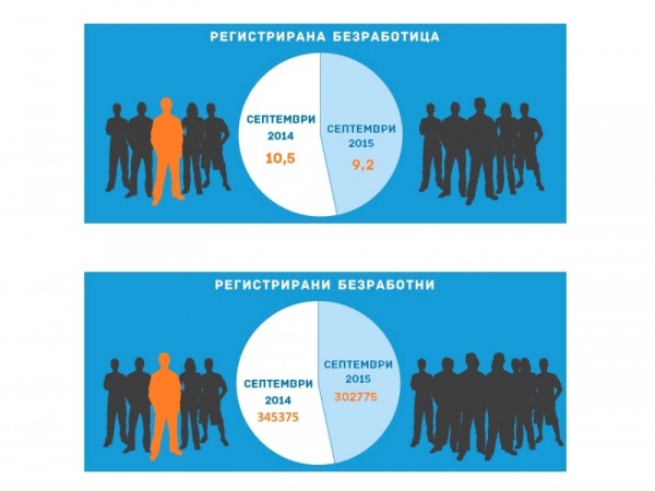 За 6-ти пореден месец регистрираната безработица у нас продължава да бележи спад. Равнището на безработица през септември 2015 г. продължава да спада в сравнение с август – с 0.1 процентни пункта до 9.2%. В сравнение със септември 2014 г. нивото на безработица е значително по-ниско – с 1.3 процентни пункта. Запазва се тенденцията за подобряване на показателите на първичния пазар на труда, изразяваща се в по-големия брой заявени работни места в бюрата по труда и постъпилите на работа безработни в реалната икономика.