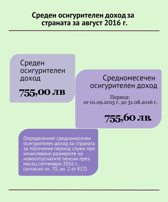 Среден осигурителен доход за страната за месец август 2016 г.