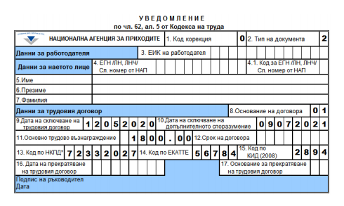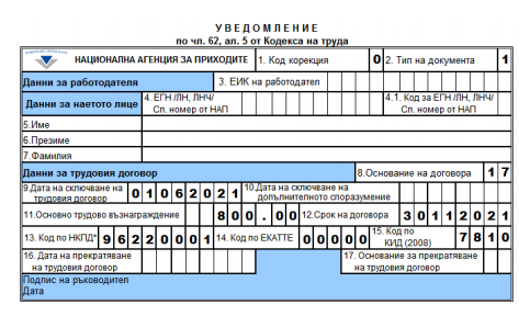 Работодателят подава уведомление за сключения трудов договор, като попълва идентифициращите данни – точки 3; 4; 4.1; 5; 6; 7 и полетата на останалите точки, с изключение на точки 10, 16 и 17: