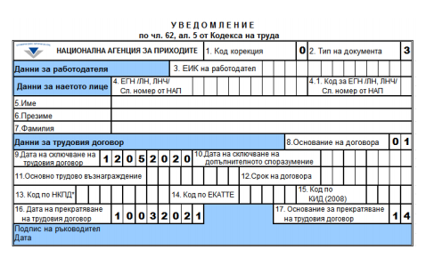Считано от 10 март 2021 г. е прекратен трудов договор след отправено писмено предизвестие от работника (чл. 326, ал. 1 от КТ). Работодателят е длъжен да подаде в НАП в седемдневен срок уведомление (приложение № 1 към чл. 1, ал. 1 от Наредба №5 от 29.12.2002 г.) за прекратяване на трудовия договор, като задължително попълва точки 1, 2, 3, 4, 4.1, 5, 6, 7, 8, 9, 16 и 17.