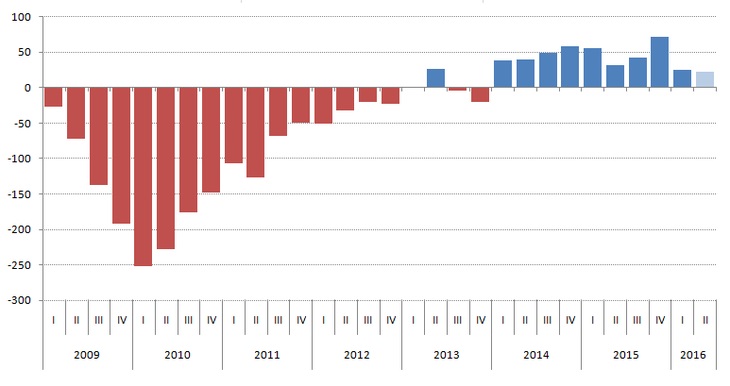 В унисон с тенденцията за увеличаване на броя на наетите на трудов договор, данните от последното 3-месечно изследване на работната сила на НСИ показват, че икономиката продължава да създава работни места. През второто 3-месечие на 2016 г. заетите достигат 3,03 млн. души, като ръстът спрямо същия период на 2015 г. е от 22,2 хил. души. В същото време, докато данните за броя на наетите на трудов договор в частния сектор от началото на тази година показват рекорден ръст от кризата насам, общият ръст на заетите в икономиката като цяло се забавя.