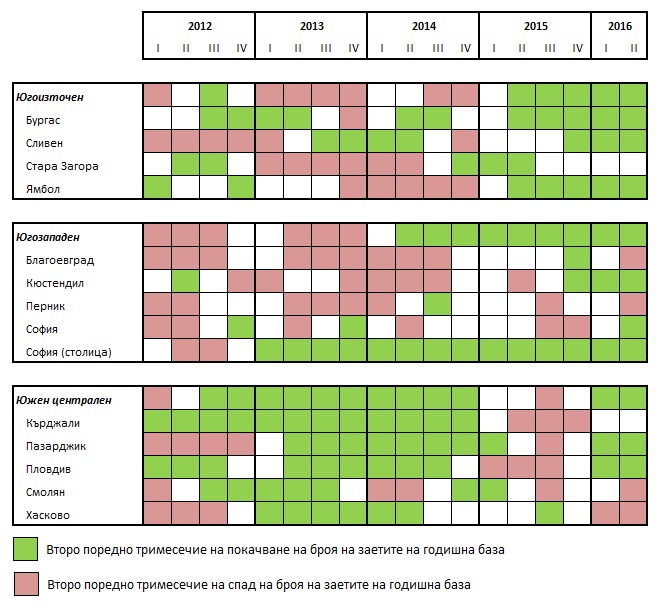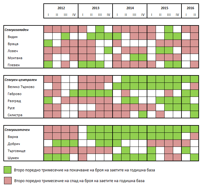 Както Северният централен, така и Североизточният район на страната продължават да увеличават броя на заетите лица, въпреки че е налице известен спад и в двата основни центъра на възстановяването от 2014 г. насам – Велико Търново и Варна. След добрите за местния пазар на труда 2014 и 2015 г., броят на заетите във Велико Търново намалява за второ поредно 3-месечие през 2016 г. Заетите в град Варна не успяват да достигнат пиковите нива от предходния летен сезон. През второто 3-месечие на 2016 г. техният брой е с около 2 хил. души по-нисък, отколкото през същия период на 2015 г.