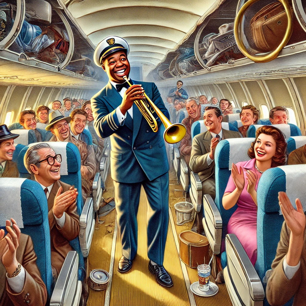 Khi máy bay đạt độ cao ổn định, Armstrong ngồi thoải mái và lấy kèn trumpet ra để kiểm tra. Tuy nhiên, tiếng kèn vang lên trong khoang máy bay khiến không ít hành khách giật mình quay lại nhìn. Thay vì dừng lại, Armstrong mỉm cười và bắt đầu chơi một vài giai điệu jazz quen thuộc.