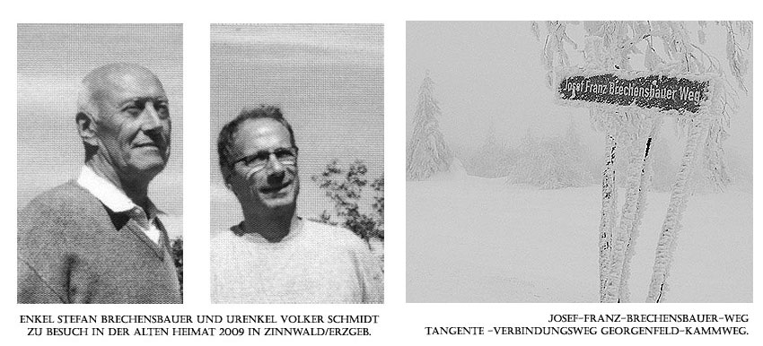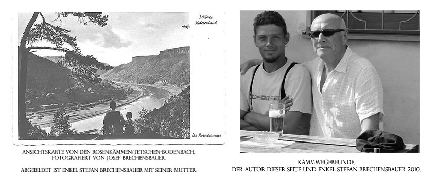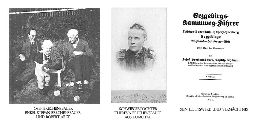 “Viele Informationen besitze ich leider selber nicht. Durch den Krieg ging vieles verloren. Ich hoffe, die folgenden Zeilen entsprechen euren Vorstellungen. Mein Großvater Alfred Brechensbauer, das einzige Kind von Josef Brechensbauer, begann seine eigenen Lebenserinnerungen mit: “Mein Vater war ein Wandersmann, und mir liegt's auch im Blut” und erzählt auch davon, wie er schon als kleines Kind mit seinem Vater die Wegemarkierungen des Kammweges mit Pinsel und Farbe besonders im Teilabschnitt des Teplitzer Bezirkes mit dem blau-weißen Kammwegzeichen markierte. Auch im beruflichen eiferte er seinem Vater nach und wurde wie dieser Lehrer.