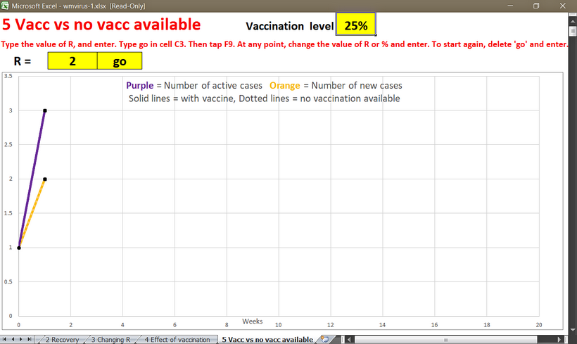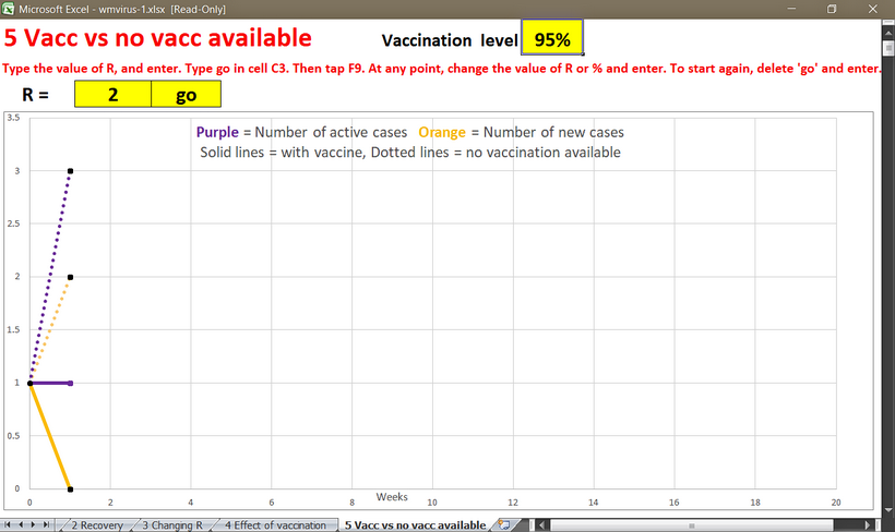 The article highlights the vaccination component of the free Working Mathematically with Viruses resource which includes video, spreadsheet software, self-directed learning, challenge and written reporting in context - all sound teaching craft. The mathematical content, in this section of the activity, includes percentages and interpreting graphs built on number patterns, multiplication and powers that have been exposed in early sections of the activity. The software is designed for students to set the parameters and investigate various scenarios. The one thing that is unchangeable is that all outbreaks start with 1 case. For example:
