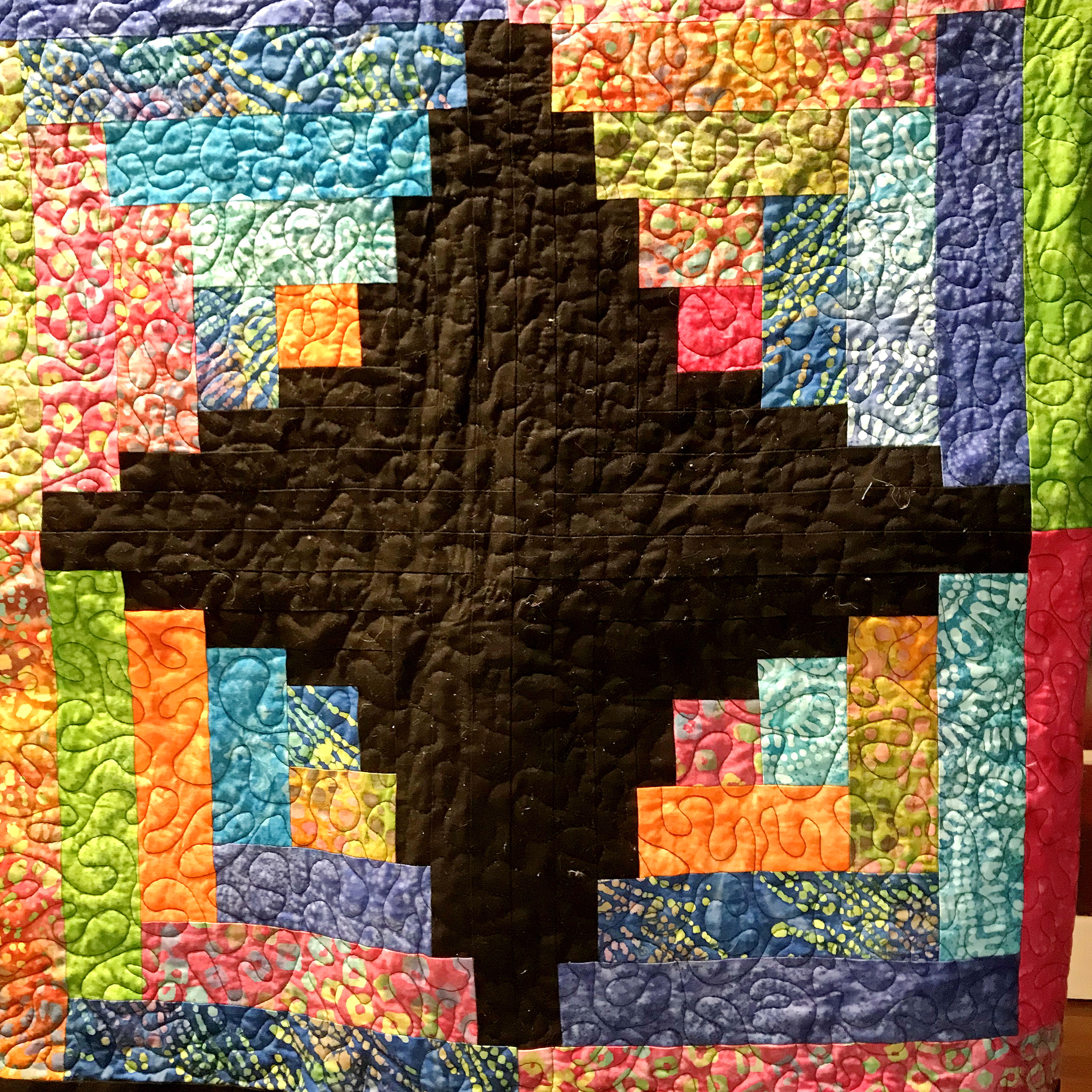 Rhonda is a quilter. This photo is one quarter of a whole quilt she made with identical panels. She was very excited when she realised that the exposed corners of the black rectangles 'make a curve'.