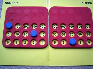 On the left is the Number Slider template provided to Calculating Changes members through the Threaded Activity with the same name (see Link List below). Two pages, a bit of tape and it's done. The image on the right shows how Poly Plug is used to create a hands on Number Slider. Non-members can easily design something similar that works for the counters or blocks they have available.