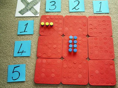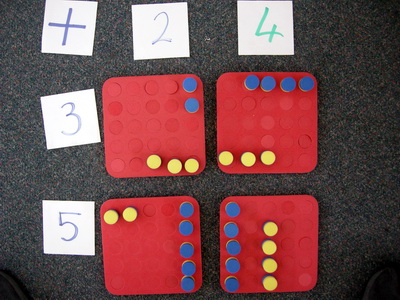 In Add Town they work out how many people should stand on an intersection - a red board - by adding up the two street numbers they can see. We can use the yellow and blue plugs to be people.