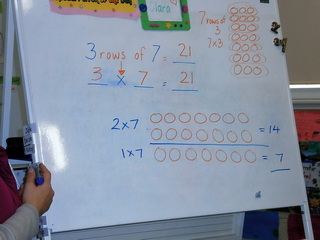 - Encourage children to see 3 rows of 7 as 3 x 7 and further encourage them to see 3 x 7 as 3 x 5 + 3 x 2.