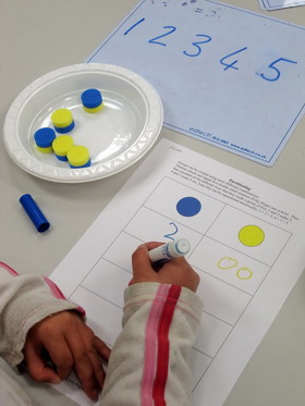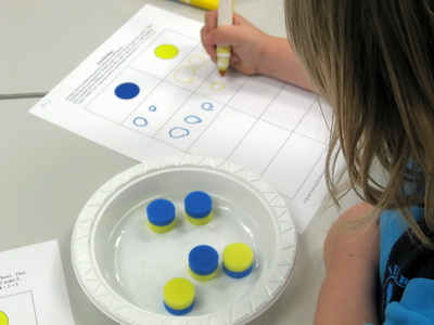 - Children record the number of blue and the number of yellow. At first this can be by drawing. Later teachers or helpers might scribe sentences like 3 and 2 make 5. Later still this can become 3 + 2 = 5 and the calculator can be introduced as a recording tool too.