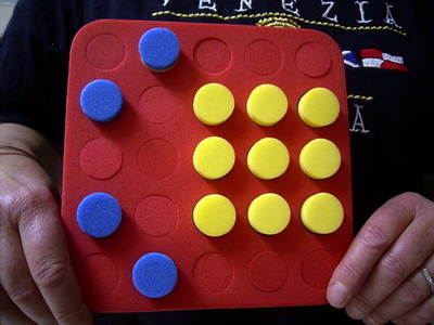 This activity could be thought of as a visual/concrete variation of Number Of The Day. Certainly the two can work well together. The teacher creates a board such as the one in the photo and shows it to the children. Each child (or pair) them makes the same board. The challenge is in not only finding how many blue or yellow plugs there are in the room, but in finding more than one way to find this out. Suitable for threading.