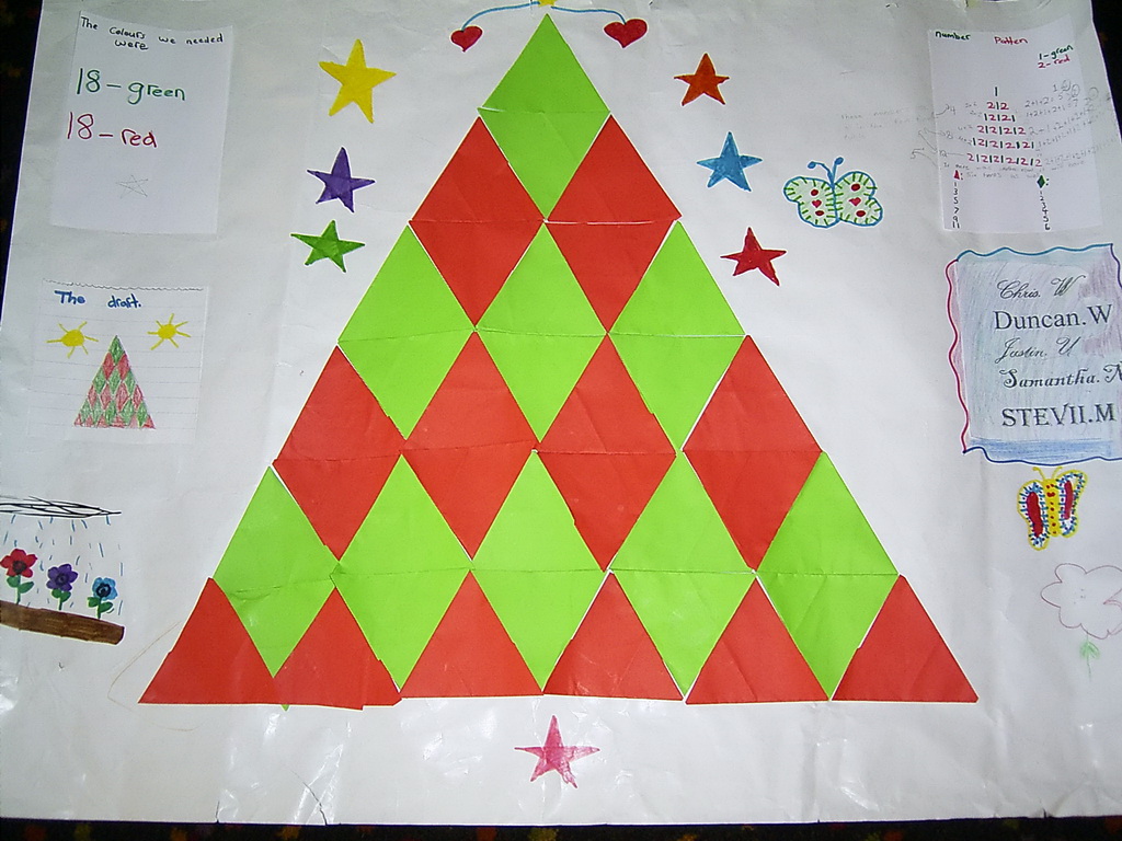 Building on the children's experiences with folding paper to make equilateral triangles, this investigation explores visual patterns made with them. Then they hunt for numbers in the patterns because, wherever there is a visual pattern there will be a number pattern and vice versa.