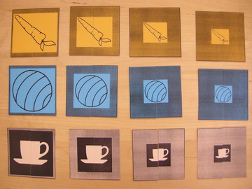 MaterialsThree pictures (teacup, beach ball, carrot), each in 4 sizes and each cut into 2 parts. Therefore 8 pieces for each picture and 24 pieces altogether.Content