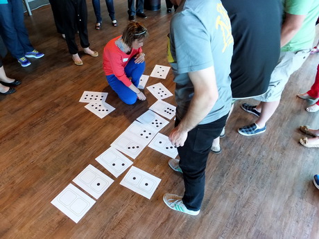 Teachers were introduced to Floor Dominoes in this segment of a six day professional development program. It was the Day 5 and they had become used to working from an open starting point. There were enough teachers so that each person had their own floor domino to contribute to the group challenges.