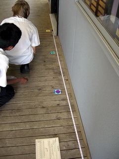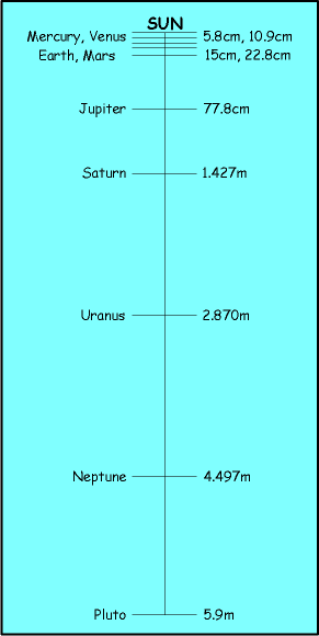 Half of the length to Pluto is about 3000 million kilometres and remarkably Uranus is at about that position. Half of the distance between Uranus and Pluto is 4500 million kilometres, and again a planet, Neptune, is there. Continuing this proportional reasoning helps to find a position for each of the other planets, with the only break from the pattern occurring between Mars and Jupiter. It was, in fact, this break from the pattern which led astronomers to look more carefully in this region and eventually discover the asteroids, which by some judgements are the fragments of a destroyed planet. At senior levels, there is an opportunity here to link with work students may be doing in science related to the formulas which govern the gravitational forces between planets. An important question to a mathematician is Can I check it another way?. In this case the placement of the planet cards along the string can be checked by application of the scale in a more precise manner, namely: