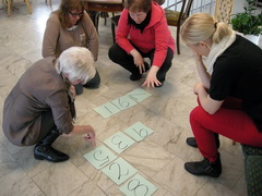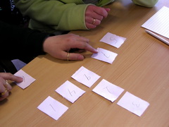 ![]() Teachers involved in Steps during a workshop day in Örnsköldsvik, Sweden Start the problem with a large set of nine digit cards you prepared earlier. Gather the students in a central place (tables or floor space) and hand out the cards. Ask the students with cards to arrange them to make a staircase. Now if we have put these down the right way, the total here ... will be the same as the total here ... and the total here ... and the total here ... All four line totals will be the same.Encourage participation with the group tiles for a while, to try to achieve this result then promise it can be done and send students to their tables in pairs to see who can be the first team to find a solution with their torn up tiles. Continue the lesson guided by the information above. Of course, you are doing this not because the mathematics content in the problem (as might be described by government curriculum documents) is of any great consequence, but rather because it is yet another powerful opportunity to model how a mathematician works. Therefore it is important to draw the lesson together with the students by asking them to tell you How we have worked like a mathematician today. For more ideas and discussion about this investigation, open a new browser tab (or page) and visit Maths300 Lesson 29, Steps, which also includes companion software. |