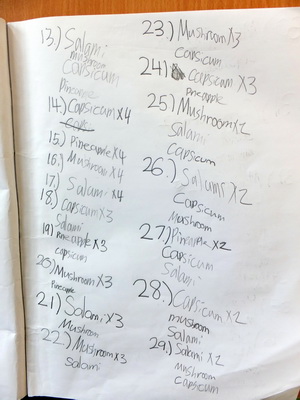 Oliver had an aversion to recording in the beginning, as evidenced by his effort for Task 196, Cross & Square (formerly Maltese Cross), even though he could have traced the pieces. This was March 18th. Later in his journal he records working on Task 183, Pizza Toppings, on both June 2nd and 13th and details three pages of possible pizzas. Whether or not he is correct in every aspect, the effort is clearly monumental in comparison to his first try.
