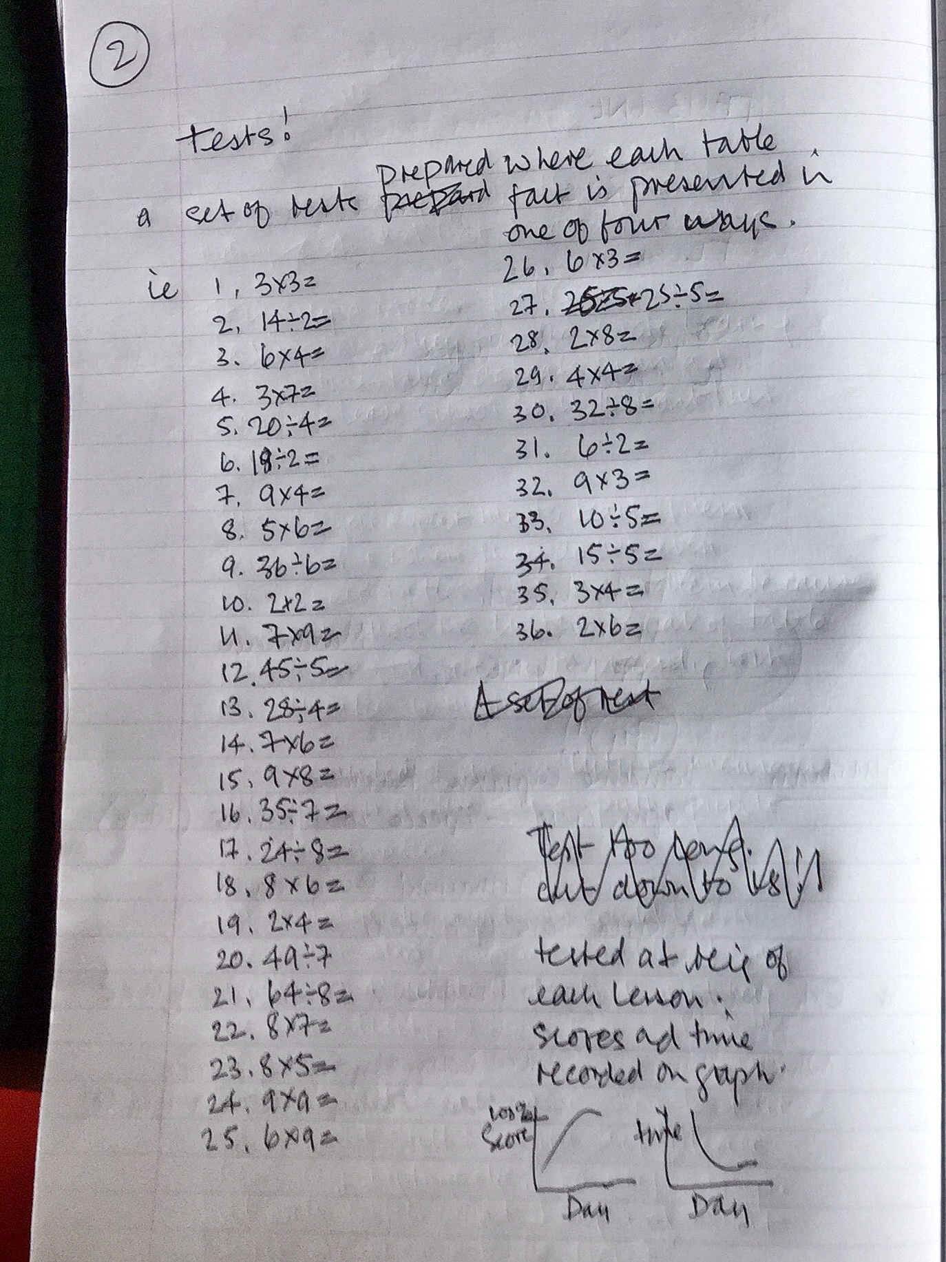 The four facts associated with the card were discussed and a few cards were introduced at the beginning of each lesson. After a few weeks the group were tested. A question on each card at random, ie: 12 ÷ 4, 4 x 3, 12 ÷ 3 or 3 x 4. The test was scored for each pupil and recorded on a personal table. Every lesson started with a test prepared on paper and pupils were given the time taken. Results were recorded and individual graphs drawn up were displayed.