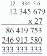 | I then predicted what the answer would be when we multiplied the same number by 27 (3 x 9). I predicted that the answer would equal 333 333 333. I then wanted to see if there was a pattern as we multiplied...