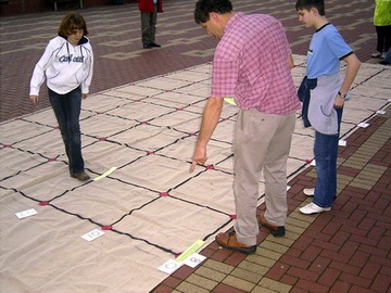 | Physical involvement (kinaesthetic learning) is a key component in playing out the whole class investigation life of many tasks. One aid that can challenge students in this way is a large plastic mat with cells big enough for a student to sit inside. Many learning opportunities develop when you have one of these mats.